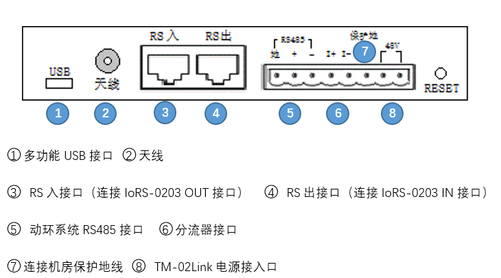 2)系統(tǒng)自組網(wǎng)接口:RS485(輸入、輸出,用于連接IoRS),1路分流器。