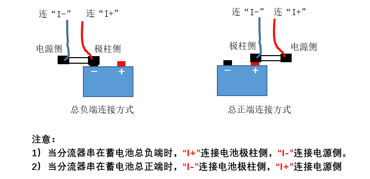 1. 當分流器串在蓄電池總負端時,“I+”連接電池極柱側(cè),“I-”連接電源側(cè)。 2. 當分流器串在蓄電池總正端時,“I-”連接電池極柱側(cè),“I+”連接電源側(cè)。 |